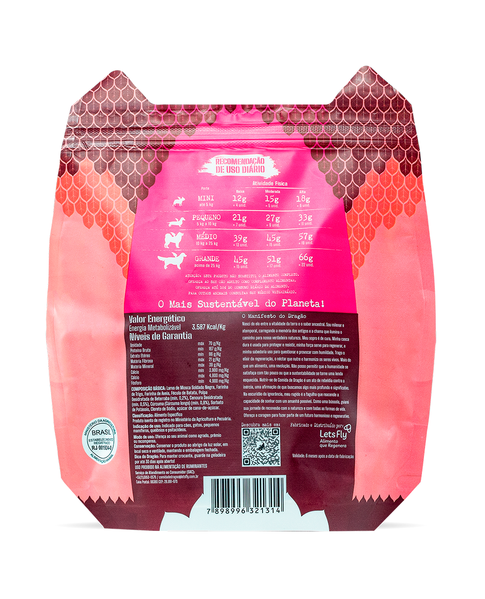 Comida de Dragão é feito à base de proteína de inseto, mais sustentável: reduz emissões, economiza água e regenera o meio ambiente.